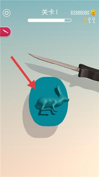 1、在关卡1中按照箭头指示,用刀具对蓝白相间的椭圆形物体进行切割操作。