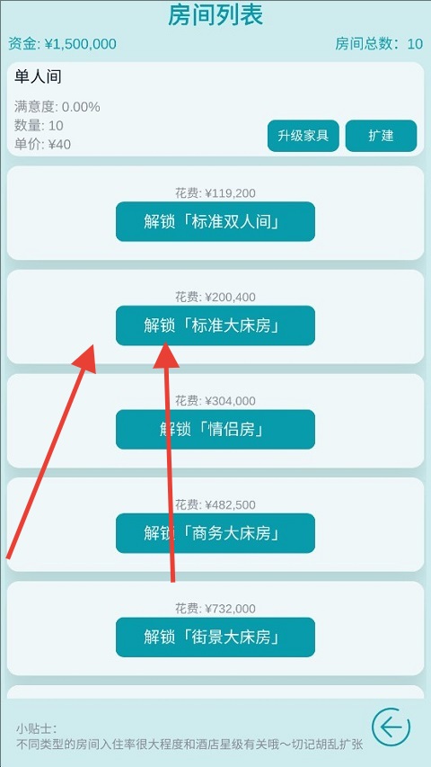 1、房间规划:前期攒资金,优先建造需求大的房型,如标准间。及时升级家具,提升房间品质,吸引更多顾客,提高入住价格 。