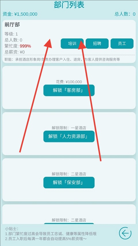2、员工管理:依据部门需求招聘员工,关注员工属性。定期组织娱乐活动,提升员工各项属性,增强工作效率与忠诚度 。