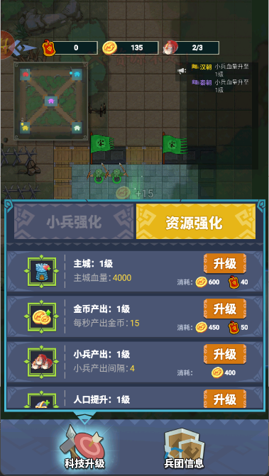 2、用金币一同用于升级主城与士兵属性,或解锁强力技能,增强整体实力。