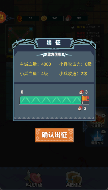 3、士兵训练调配,运用金币招募士兵,升级士兵提升战斗力。依据战场形势,点击派遣士兵进攻其他主城,合理规划出兵数量。