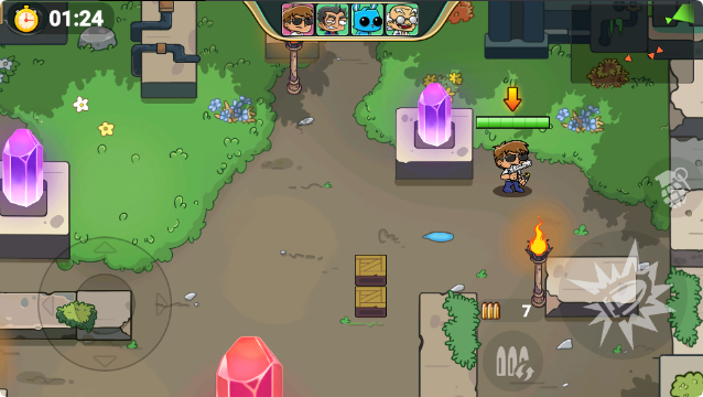 2、通过左下角的摇杆来进行移动,点击右下角的攻击键来进行攻击。