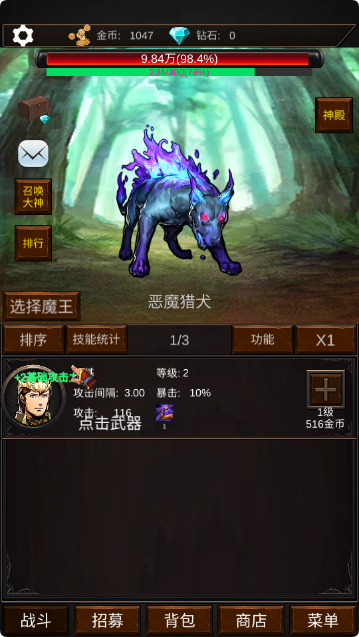 2、进入游戏后,按住屏幕不动,会自动攻击,到达一定的金币可给勇者升级。