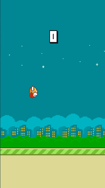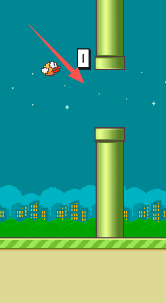 2、手指轻点屏幕,控制小鸟一蹦一跳地飞行,小心避开那些绿色的管道哦。