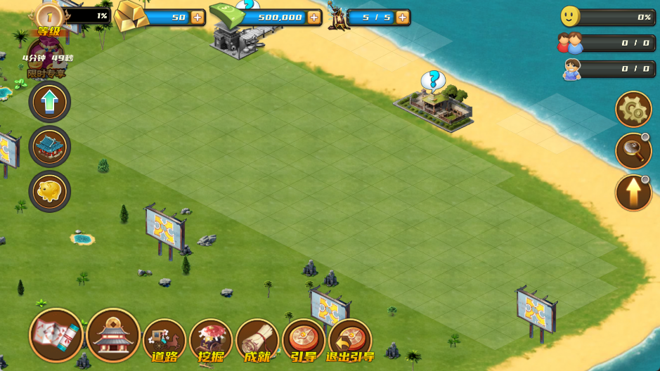 1、进入游戏后首先选择绿地位置建造民宅,消耗钞票购买并安置在空地上。