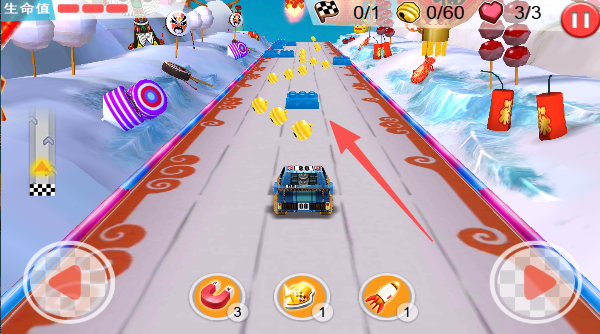 2、轻点左右键灵活转向,避开障碍,别忘了收集路上的金色铃铛。