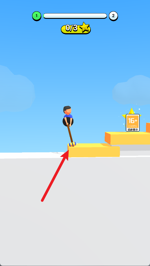 1、进入关卡后,通过手指操作控制铁锤方向,将铁锤勾住场景中的固定物体(如岩石、平台),借力拉动角色移动。