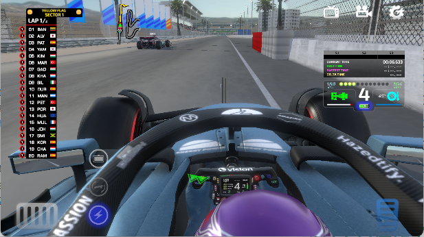2、竞速执行阶段,起步时把控离合与油门比例避免打滑,直道开启 DRS 提升速度,过弯采用循迹刹车技巧,按策略进站更换轮胎。
