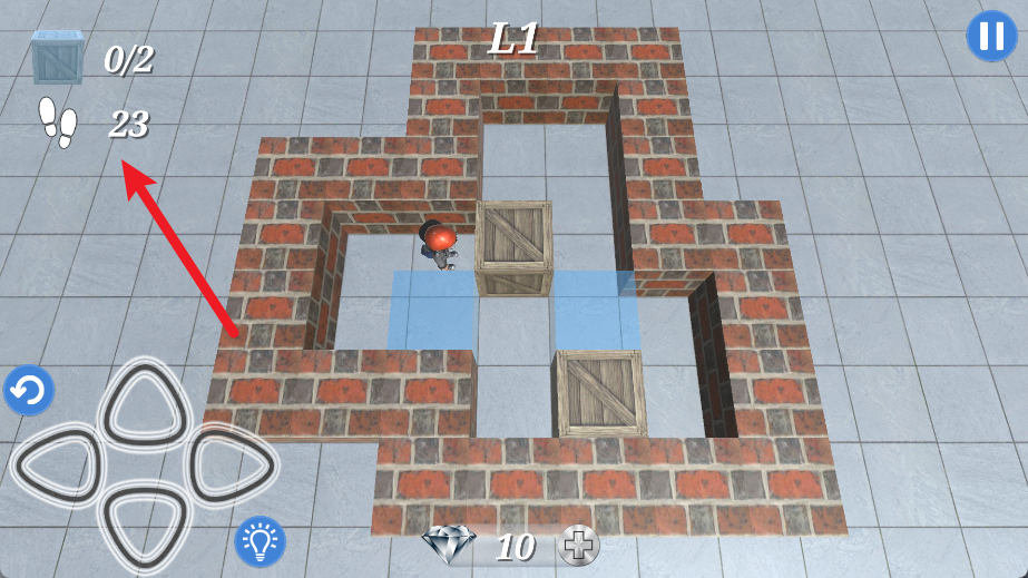 2、通过手指滑动操控角色移动,靠近箱子后向目标方向推动,注意避免将箱子推至死角(无法再移动的位置),同时关注剩余步数,确保在限制内完成所有箱子摆放。