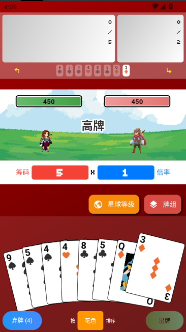 2、对战时,从牌组中选择最多5张牌出牌,系统根据牌型筹码和倍率计算伤害,持续攻击直至打完精怪血条。