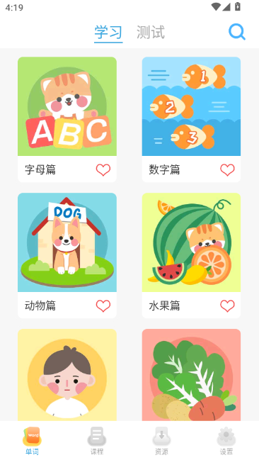 1、打开软件后,孩子可根据自身兴趣选择对应英语学习模块,模块内以动漫图片形式呈现各类生活词汇,便于直观认知。