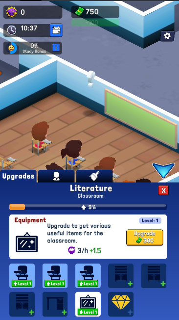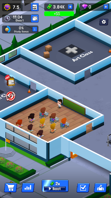 《空闲高中大亨官方版》是有趣的校园模拟手游,采用卡通可爱画风,所有人物均为Q版卡通形象,带来独具特色的游戏体验。使用者在游戏中化身学校校长,需欢迎学生入学、招募老师并考核各学科师资,建设各类校园设施。通过多种方式提升学生成绩以提高学校知名度,知名度越高生源越多,还可获取资金后完善设施、按心意规划校园布局,充分发挥校长能力。