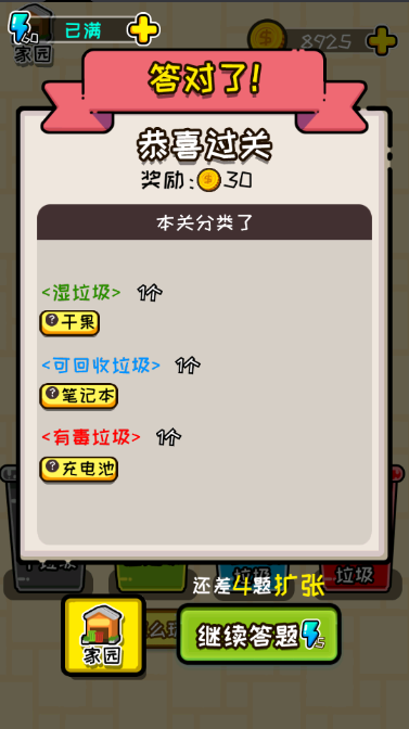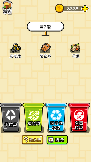 3、若垃圾桶出现√图标,表示分类正确,若垃圾桶出现×图标,表示分类错误,分类错误会扣除金币。