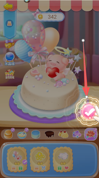 2、按照任务要求,给蛋糕点上魔法气球、摆上小玩偶,把它打扮得比小魔仙还闪亮耀眼。