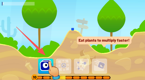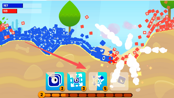 1、开局盯紧我们的小目标,戳一下屏幕底部的技能,就能发射出你的蓝色方块先锋军。
