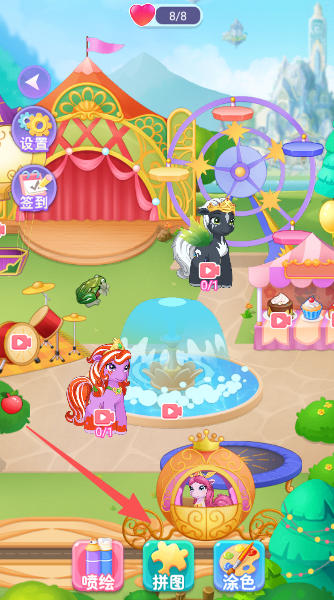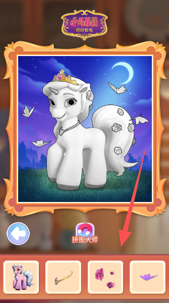 2、拼图是我的最爱,看准下方百宝箱里的漂亮道具,拖动它们,给小马来个闪亮大变身。