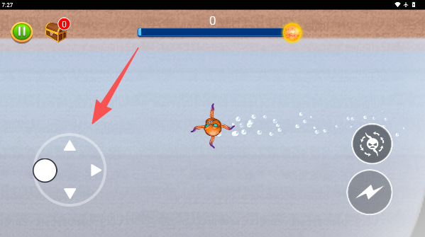 1、用手指按住左边的小摇杆,指挥你的八爪鱼在海底溜达,看见像骨头一样的小零食就冲过去一口吞掉。