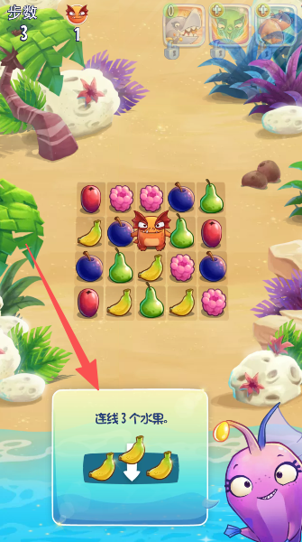 2、在五彩斑斓的果盘上,手指一划连接三个以上相同水果,消除的冲击波就能砸晕蜥蜴。