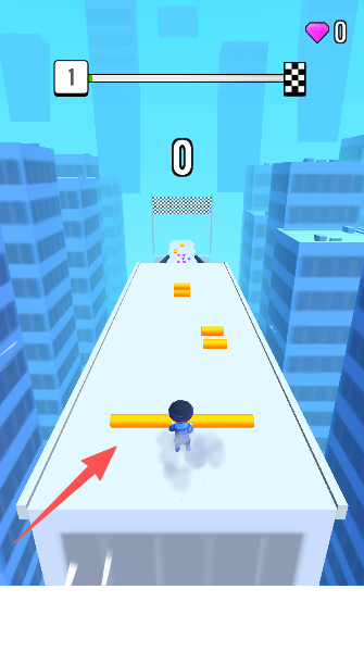 1、操控小人在屋顶上飞奔,躲开扎人的红尖刺,狂捡黄方块和粉爱心才是正经事。