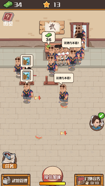 1、看着学员们哼哼哈嘿地练功,顺手点一下就能收金币,武馆小金库瞬间满满当当。