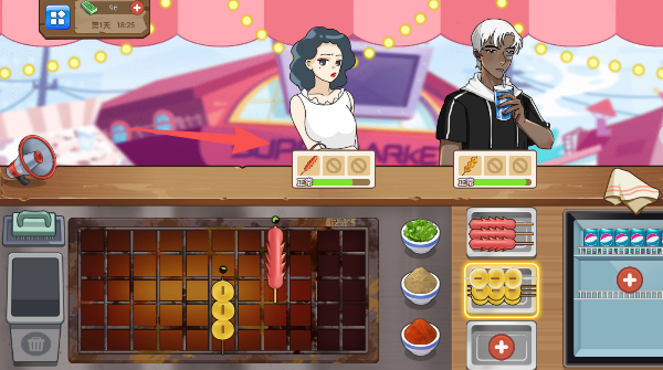3、 夜市主题场景包含多种特色小吃与烧烤菜品,操作简单但订单组合策略多变。