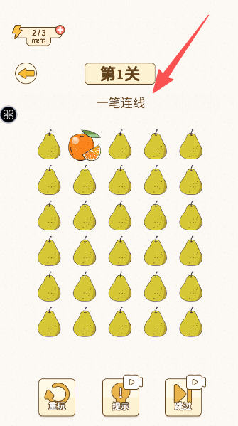 1、看着满屏的水果,规则就一条:把两个相同的果子用一根线连起来,不能断哦。