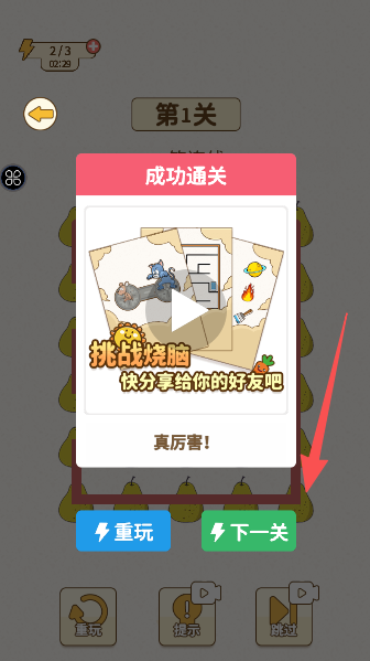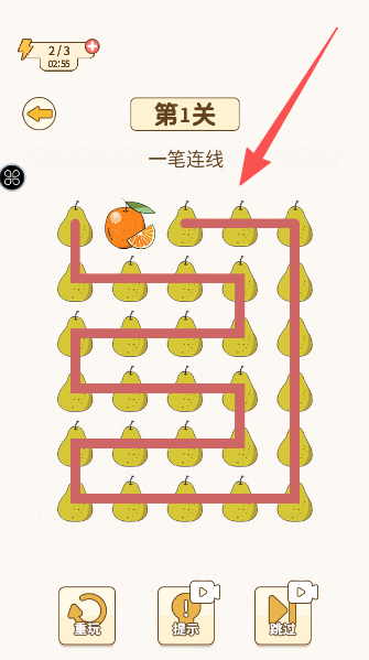 2、手指当画笔,在屏幕上划一下,让相同的苹果、香蕉成功“牵手”就算过关。