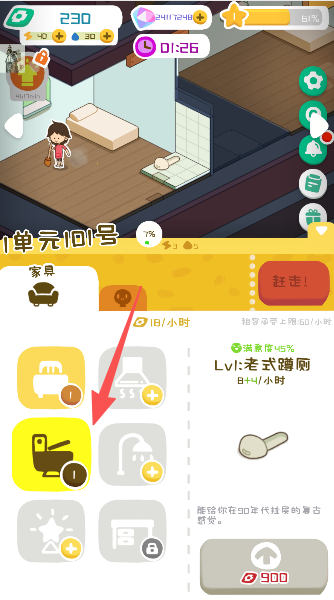 1、包租婆一声令下,赶紧点开装修面板,给空置的小单间换个新装,好让它快点“上岗”赚钱。