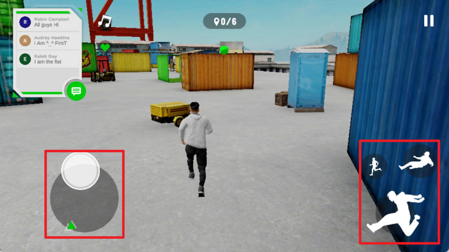3、进入对局,左下角控制角色移动,右下角控制角色跳跃和蹲下。