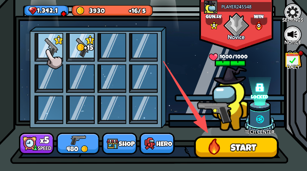 1、冲进武器库挑把好枪,然后麻溜点下开始,准备在太空里上演一场“吃鸡”大戏。