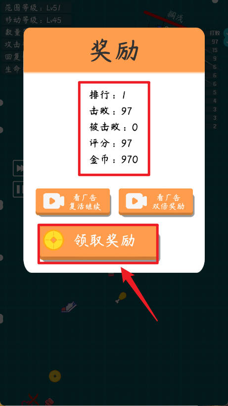 2、游戏结束后,获得排名和金币奖励,点击即可领取。