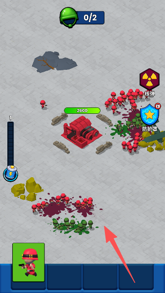 2、手指狂点屏幕,让小兵像潮水一样涌过去,压过绿队防线,把他们挤回老家。