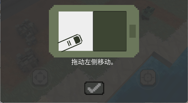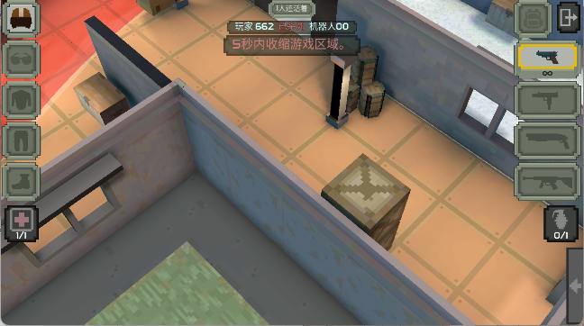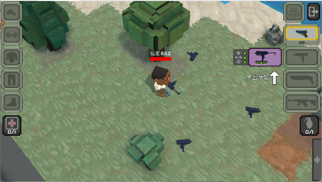 1、进入游戏后匹配对手,通过标点传送方式进入桌面式像素战场,借助左侧虚拟摇杆控制角色移动,熟悉右侧射击与互动按键操作。