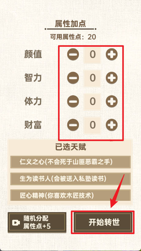 2、点击自由分配20个属性点。