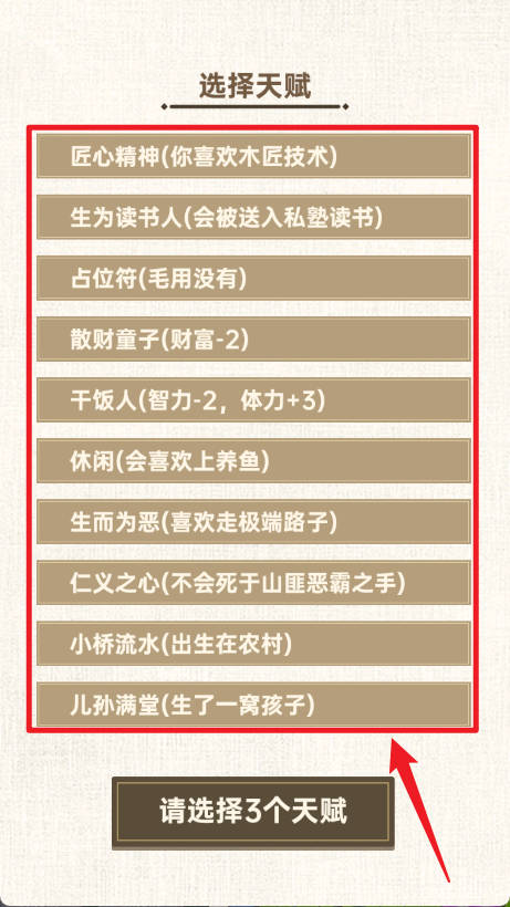 1、操作逻辑简易,点击完成天赋抽取、属性分配与事件抉择,纯文字界面信息清晰,快速上手。
