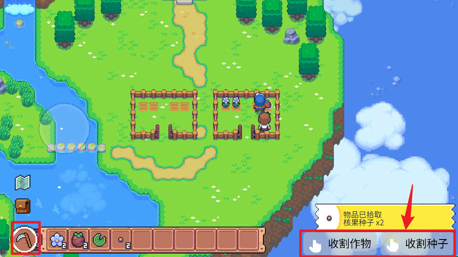 2、点击左下角镰刀使用,再对农作物进行收割。