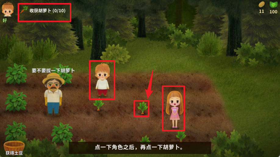 3、点一下角色后,再点一下胡萝卜,完成左上角采摘胡萝卜任务。