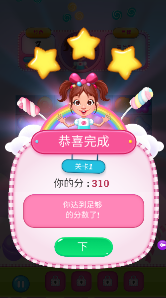 3、分数条一满,恭喜过关!赶紧点下一关,更多甜蜜挑战正排队等着你去消灭呢。