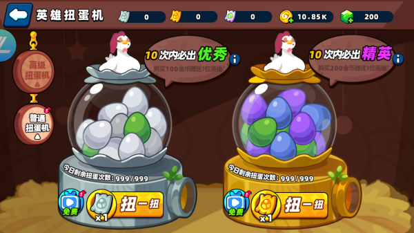 2、资源分配,羽毛优先升级主C等级,钻石攒足10连抽保底高品质小鸡,提升核心战力。