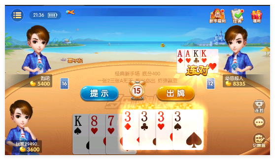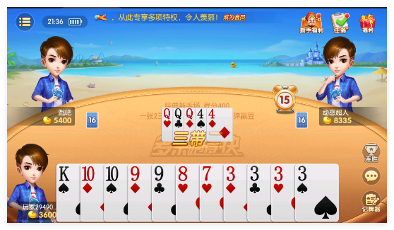 1、选择对战模式后进入游戏,系统分发16张牌,快速梳理手牌组合,熟悉出牌规则,根据牌型强弱制定初步出牌策略。