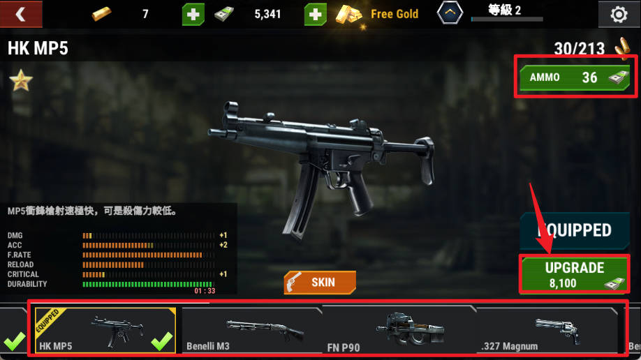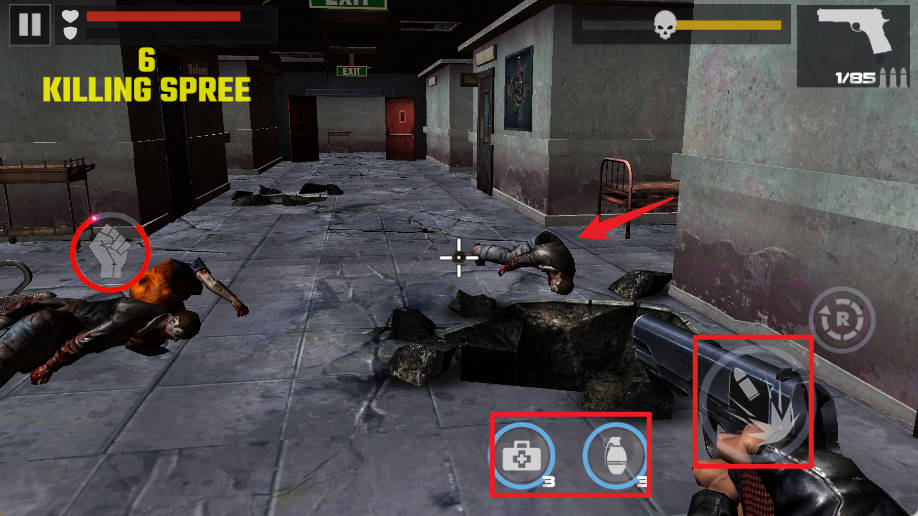1、点击右下角进行射击,可使用医疗箱和手雷。