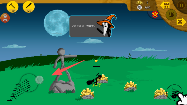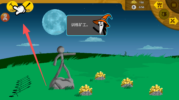 2、指挥矿工冲向金矿,看着金币哗哗进账,家里有矿心不慌,暴兵推塔才有指望。