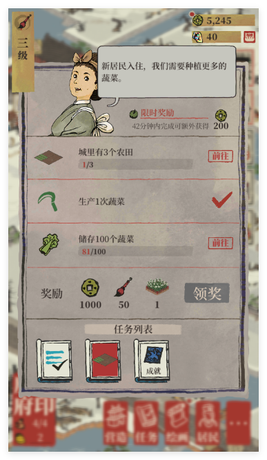 3、参与城外探险解锁剧情碎片,完成雅集任务兑换限定建筑,应对流寇、灾害等随机事件,逐步打造繁荣江南城市群。