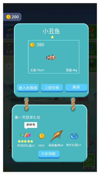 3、成功钓获鱼儿后,可将其放入专属水族箱中收纳,或者选择三倍价格或卖掉。