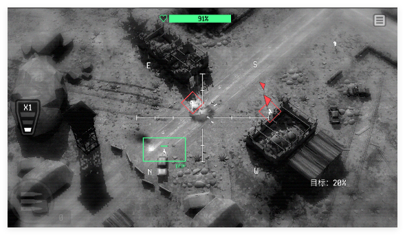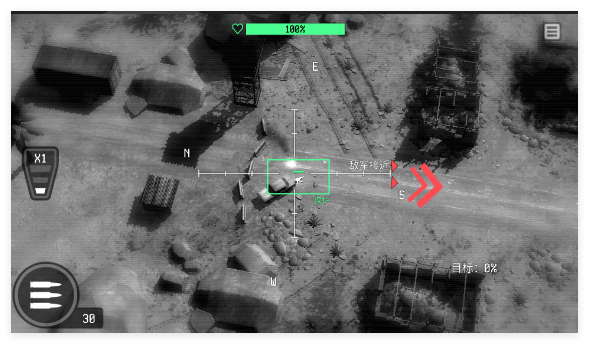 1、进入关卡后操控无人机展开行动,锁定地面敌方目标实施射击打击,同时时刻留意友方位置,避免误击或使其遭敌方攻击。