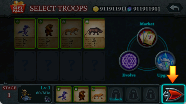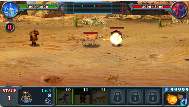 2、针对三路兵线布局防御,利用动态战场的地形与天气调整战术,用无限资源快速解锁高阶生物与红色品质装备,强化战力。
