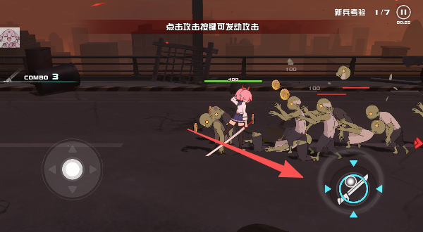 1、操控JK少女灵活走位,对着僵尸们挥剑连砍,剑光飞舞中连击数飙升,金币叮当入袋。