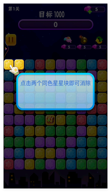 1、进入游戏后,点击两个及以上相邻同色星星即可消除。