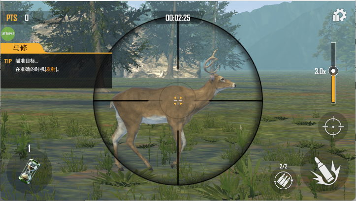 1、进入荒野场景后,追踪动物足迹与粪便,在下风向潜伏靠近,结合风速调整瞄准角度,明确 “寻迹 - 潜伏 - 精准出击” 核心狩猎路径。