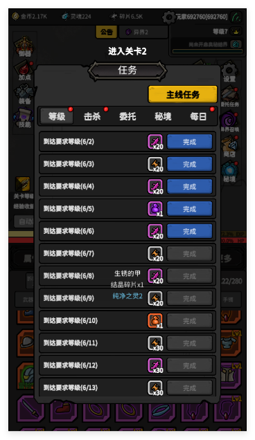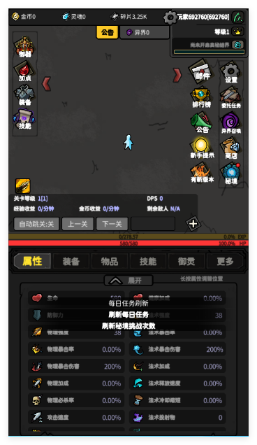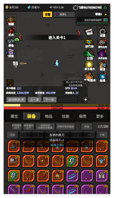 1、进入游戏后熟悉上下分屏界面,开启自动战斗模式,让角色持续刷怪获取装备、材料等奖励。